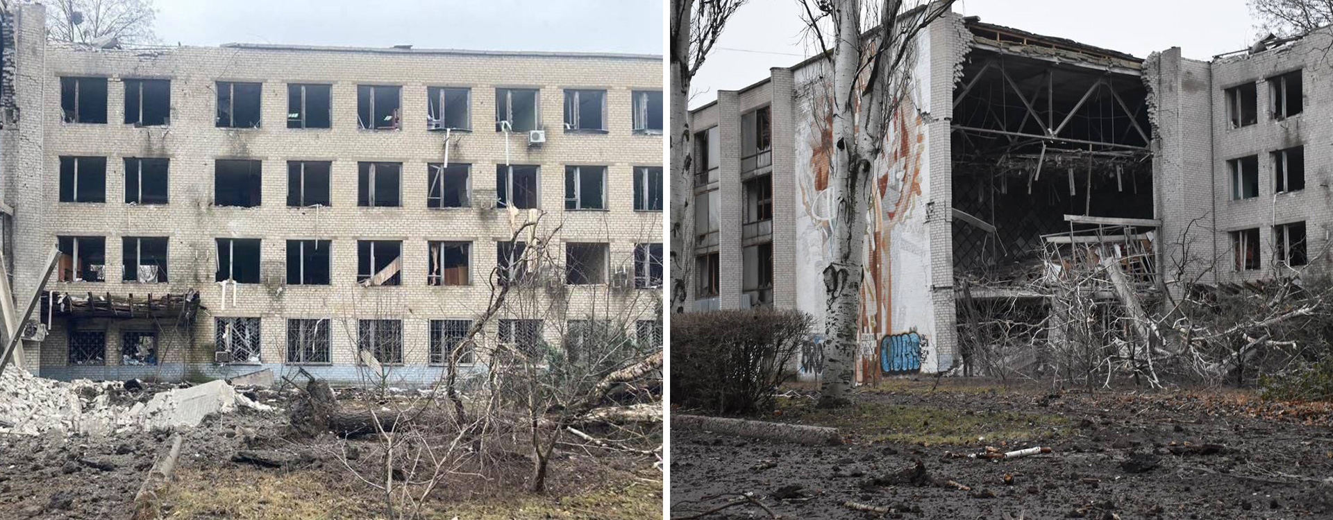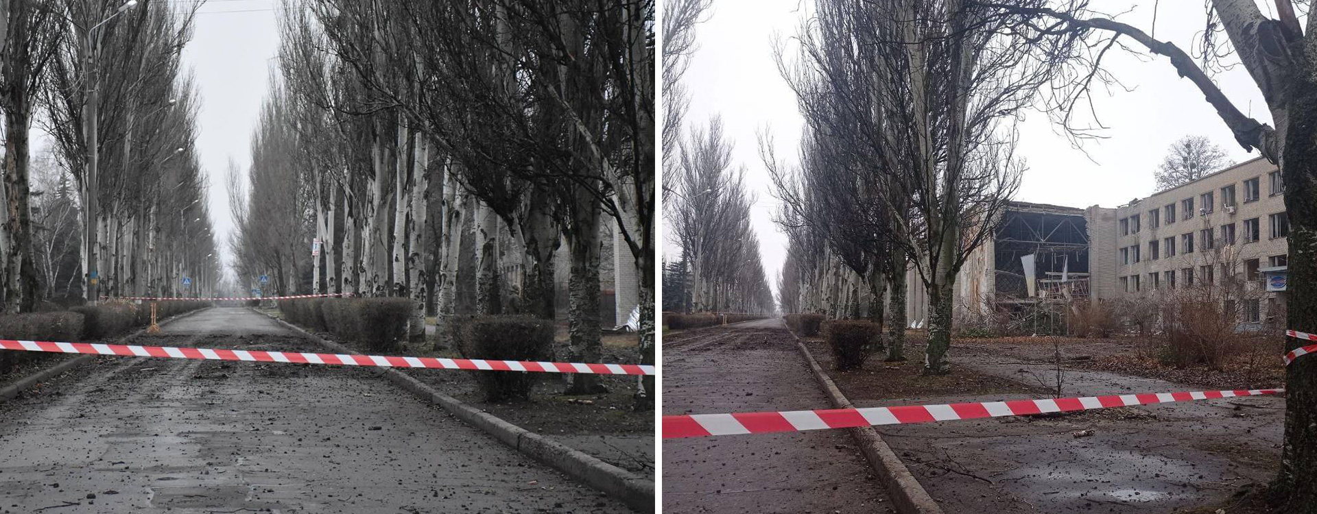 Fotos von Gebäuden und deren Zerstörung vor und nach Kriegsbeginn.