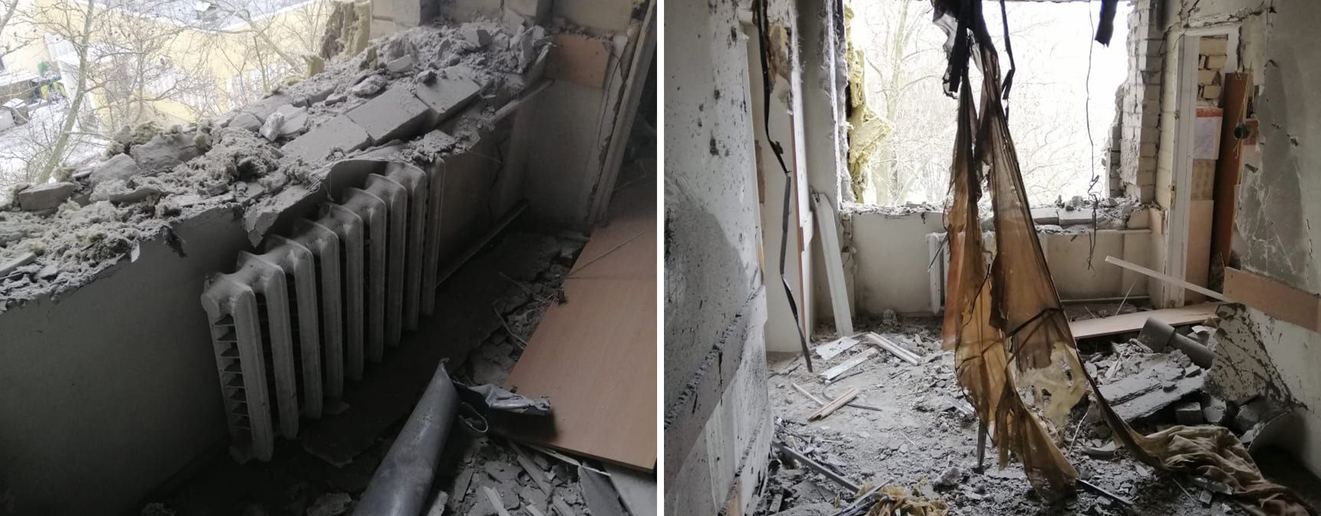 Fotos von Gebäuden und deren Zerstörung vor und nach Kriegsbeginn.