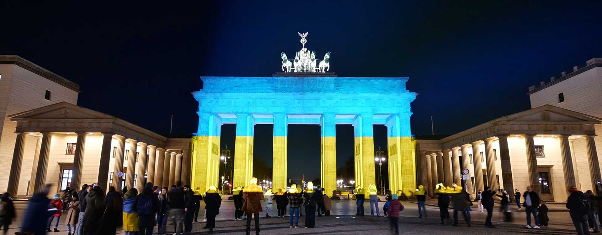 Train and underground service was interrupted in some parts of the German capital as thousands made their way to the Brandenburg Gate in central Berlin, near the Russian embassy.