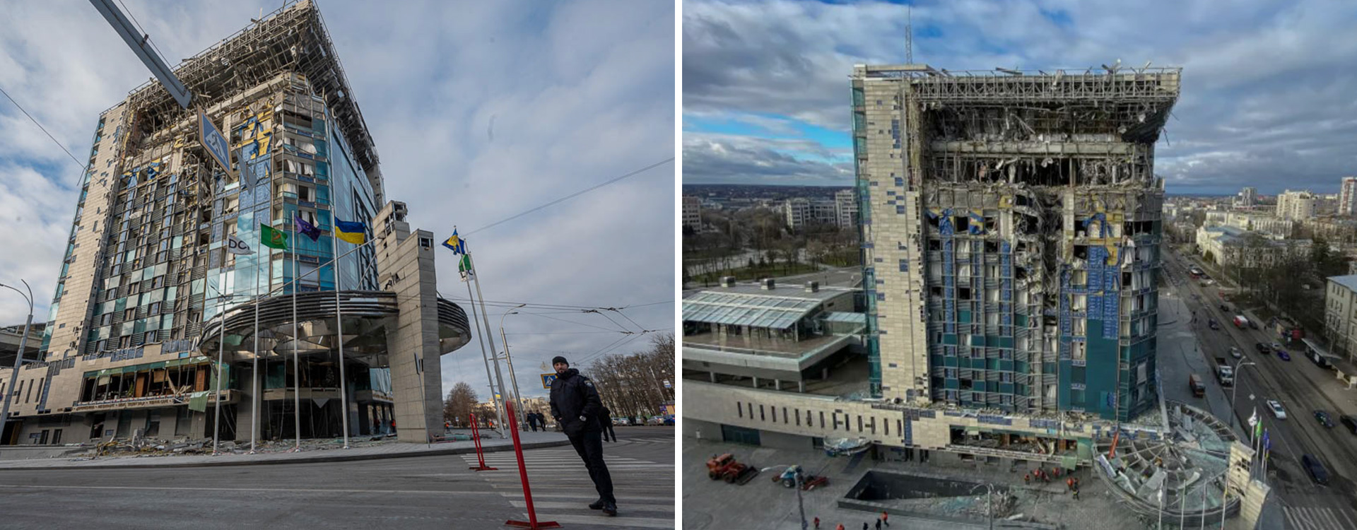 Photos de bâtiments et de leur destruction avant et après le début de la guerre.