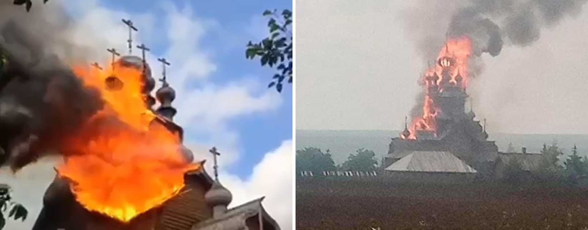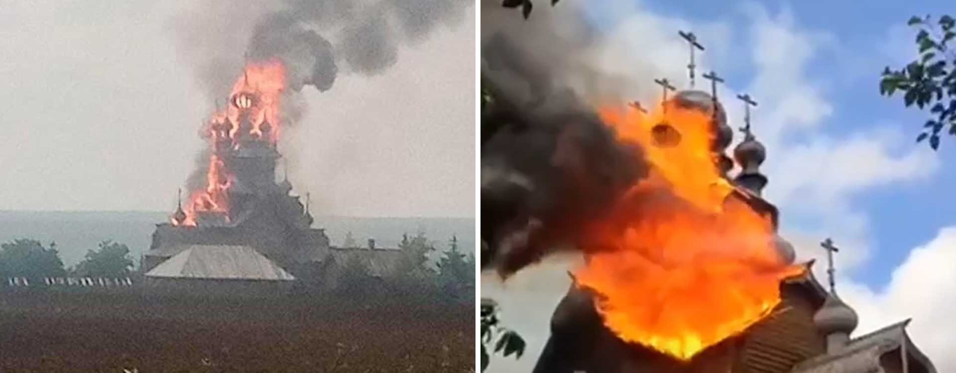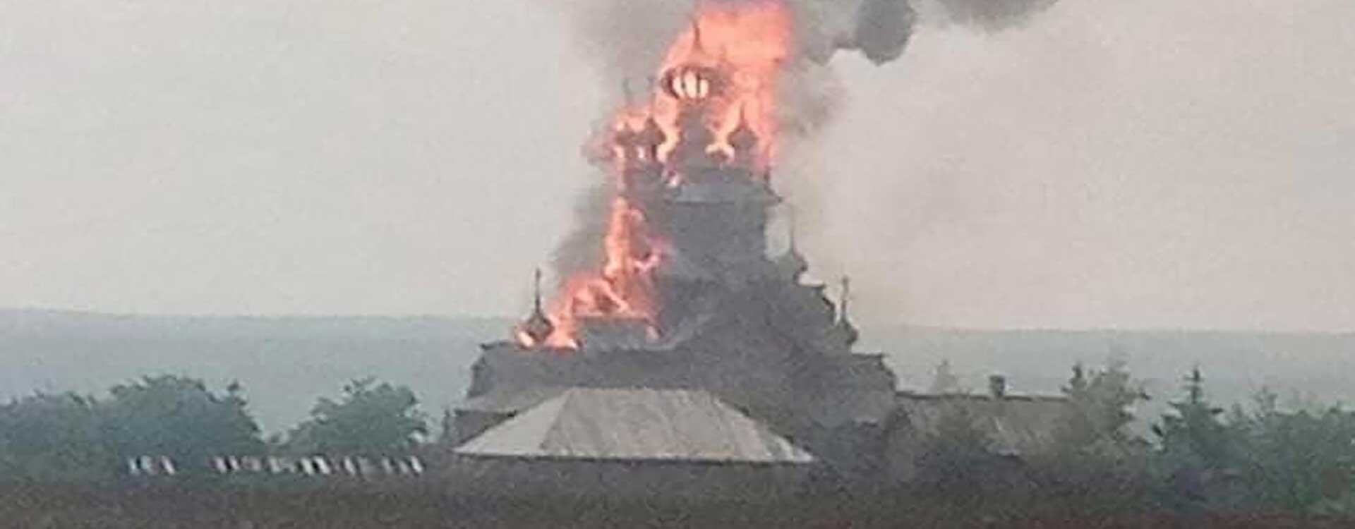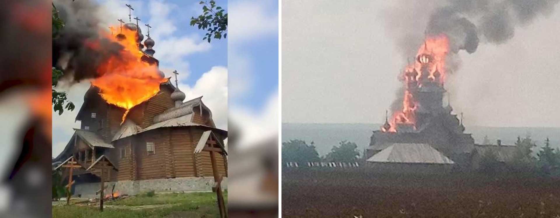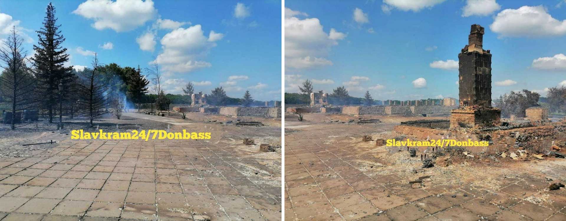 Le 4 juin 2022, le skete en bois de la Laure de la Sainte Dormition Sviatogorsk dans le village de Tetyanivka, Oblast de Donetsk, a brûlé à cause des bombardements des troupes russes.