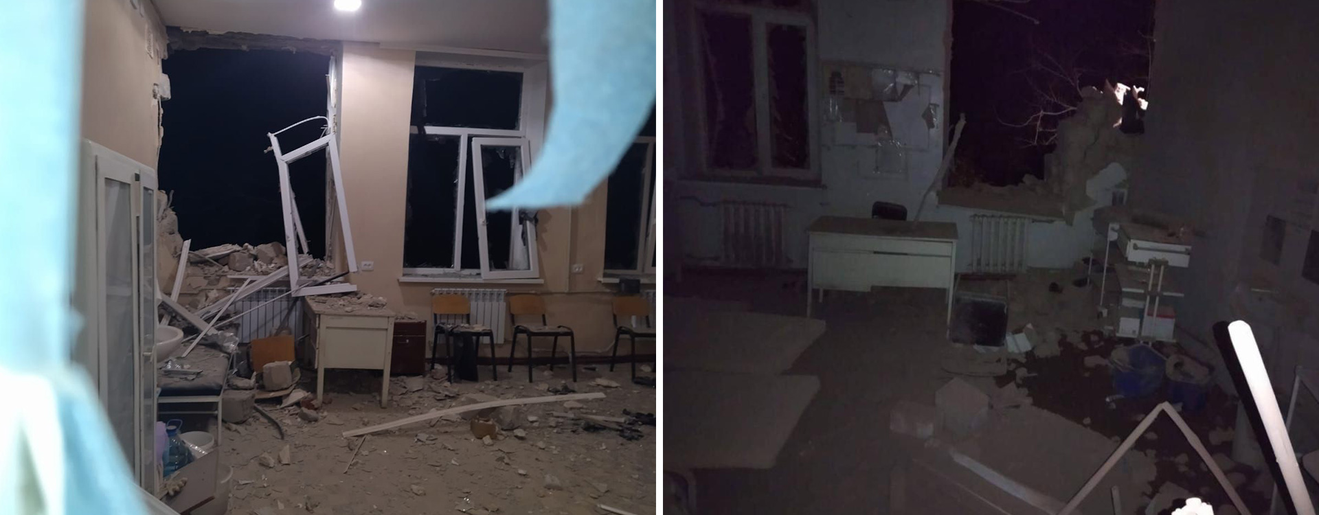 Les occupants russes ont bombardé l'hôpital après minuit avec des Grads et de l'artillerie. Ils ont bombardé l'ensemble de l'hôpital, des trous d'obus dans les bâtiments, et l'hôpital a été gravement endommagé : tous les bâtiments ont subi des tirs - la maternité, la chirurgie et la polyclinique. Le cabinet a été complètement détruit et le mur a été fracassé. Personne n'a été blessé. Le personnel de l'hôpital a réagi rapidement aux bombardements et a réussi à se réfugier dans un abri anti-bombes avec les patients. Les patients sont en train d'être évacués. Le centre médical a récemment été réparé après les bombardements précédents : le toit a été réparé et les fenêtres cassées ont été vitrées. Certaines des ouvertures de fenêtres, qui ne pouvaient pas être réparées, ont été murées avec des parpaings.