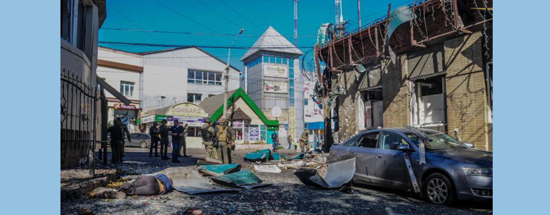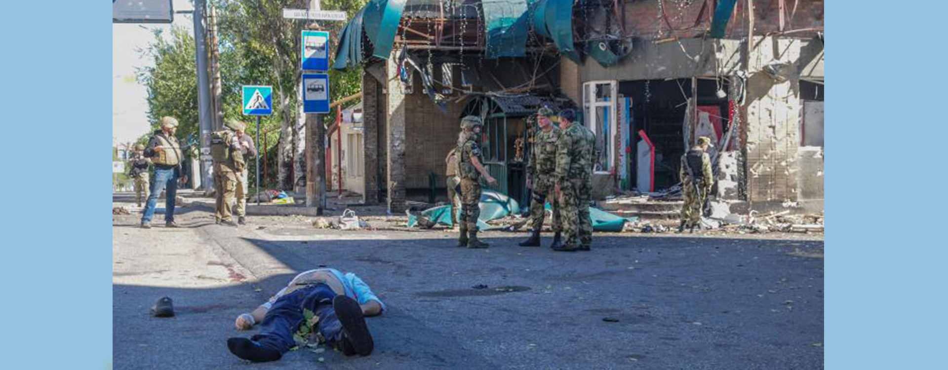 Збройні сили РФ знищують мирне населення навіть у зайнятих ними містах. В українському місті Донецьку, що знаходиться на непідконтрольній Україні території, був здійснений черговий терористичний акт з боку ЗС РФ. Вдень було обстріляно площу Бакинських Комісарів. Загинуло 13 осіб, є поранені. Росія стверджує, що обстріл був здійснений великокаліберним західним озброєнням з боку України. Українська сторона від коментарів утрималася. За відпрацьованою схемою, в короткі терміни на місці злочину з'являлися пропагандистські журналісти. За завданими збитками можна зробити висновок, що цей епізод є черговим "самострілом". Великокаліберне озброєння залишає значно більші руйнування, а застосування міномету, який, ймовірно, і використовували війська РФ, можна вважати достовірним. Нести вогонь з міномета по місту з боку України не є можливим через віддаленість українських військ від міста і малу дальність стрільби міномета.