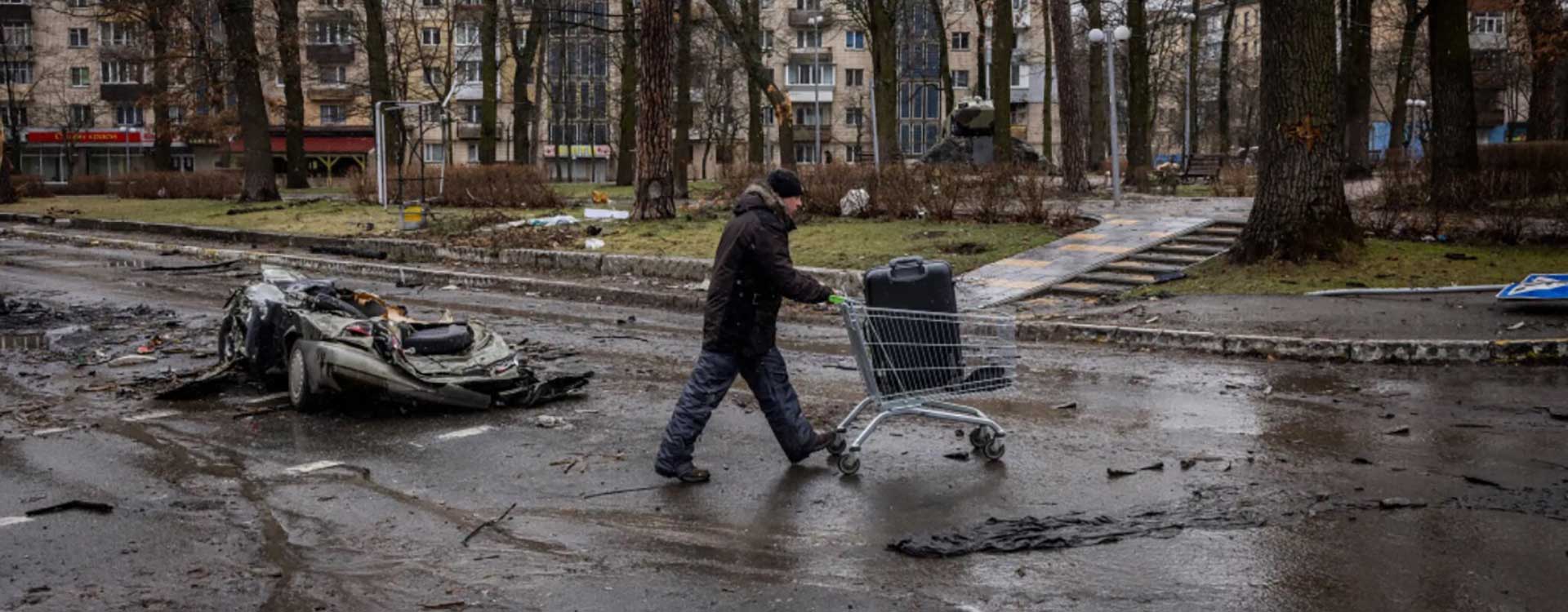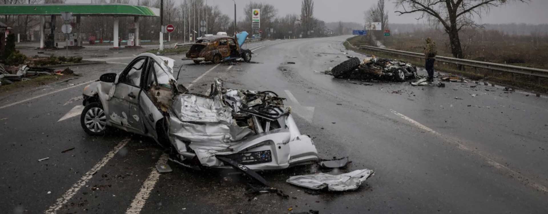 «Військові Російської Федерації просто їхали і тиснули на все, що траплялося на дорозі», - прокоментував журналіст. Розчавлені бронетехнікою РФ, понівечені, обстріляні та спалені машини у місті Буча (Київська область, Україна). В одній із машин, «Таврії», якою, очевидно, проїхав танк, досі знаходиться тіло водія, яке не встигли дістати.